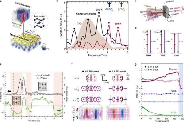 研究通過動(dòng)力學(xué)相場(chǎng)模擬發(fā)現(xiàn),PbTiO3/SrTiO3超晶格中的極性斯格明子具有一系列低于2THz的集體動(dòng)力學(xué)模式,其頻譜與基于鈮酸鋰產(chǎn)生的太赫茲脈沖高度匹配。研究依托太赫茲光譜單元發(fā)展的太赫茲場(chǎng)致二次諧波技術(shù),利用強(qiáng)場(chǎng)單周期太赫茲脈沖實(shí)現(xiàn)了與上述集體模式的共振耦合,從而相干地驅(qū)動(dòng)體系進(jìn)入一個(gè)瞬態(tài)的、具有宏觀極化的隱藏極性相,并在4K至470K的超寬溫度范圍內(nèi)實(shí)現(xiàn)穩(wěn)定調(diào)控。研究進(jìn)一步通過干涉式太赫茲場(chǎng)致二次諧波技術(shù),捕捉到瞬態(tài)極化的多重翻轉(zhuǎn),并識(shí)別出0.2THz與2.1THz兩個(gè)特征激發(fā)模式。