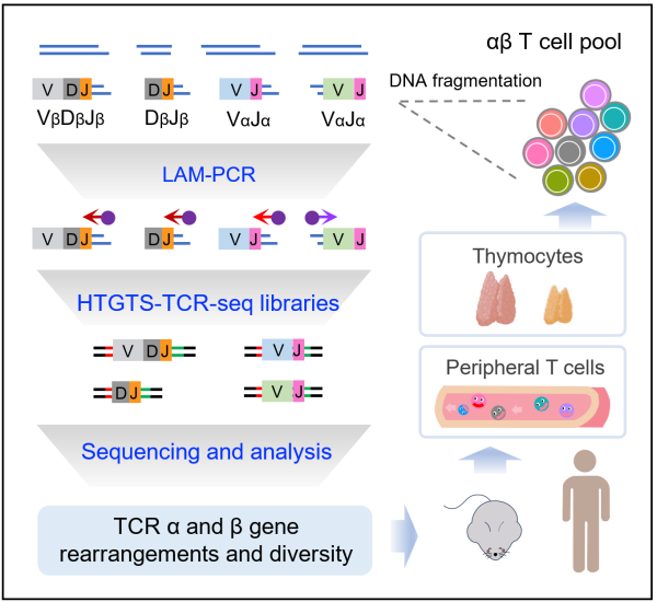近日,中國科學(xué)院分子細胞科學(xué)卓越創(chuàng)新中心代海強研究組與吳薇研究組,基于高通量全基因組易位測序技術(shù),開發(fā)出新型DNA測序方法HTGTS-TCR-seq,旨在精準解析αβ T細胞受體(TCR)重排過程。
