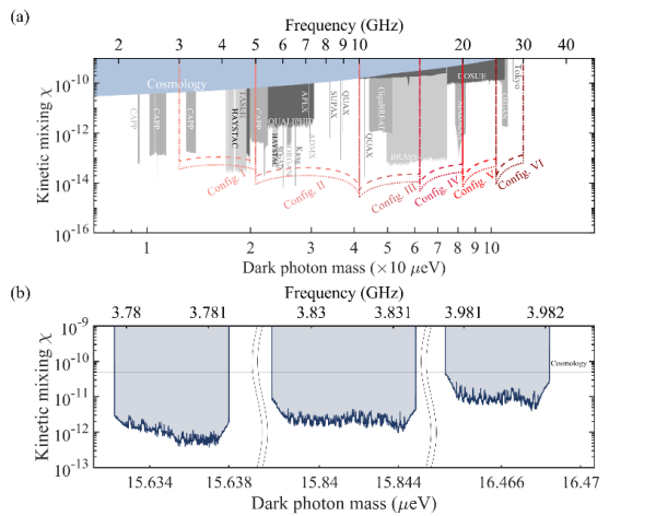 該研究提出利用超導(dǎo)量子比特直接搜尋超輕暗物質(zhì)的實(shí)驗(yàn)架構(gòu)。研究利用微納加工技術(shù),在單個(gè)芯片上集成多個(gè)頻率可調(diào)的超導(dǎo)量子比特,形成可擴(kuò)展的暗物質(zhì)搜尋架構(gòu)。這一架構(gòu)可對(duì)暗物質(zhì)多能區(qū)同步開(kāi)展高靈敏掃描探測(cè),有望解決測(cè)量范圍與靈敏度難以兼顧的問(wèn)題。同時(shí),研究設(shè)計(jì)制作了三比特超導(dǎo)量子芯片,可同時(shí)對(duì)15.632-15.638、15.838-15.845及16.463-16.468μeV三個(gè)能區(qū)的暗光子進(jìn)行搜尋,并給出相應(yīng)區(qū)間內(nèi)最嚴(yán)格的暗光子-光子耦合界限。研究發(fā)現(xiàn),實(shí)驗(yàn)結(jié)果相較此前基于天文觀測(cè)的界限提升了1至2個(gè)數(shù)量級(jí)。