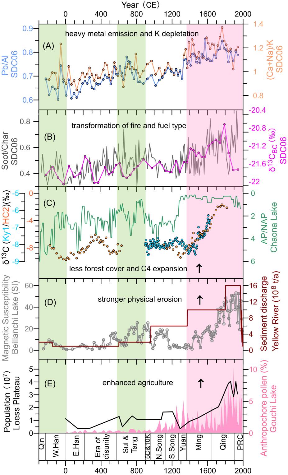 結(jié)果顯示,化學(xué)風(fēng)化強(qiáng)度總體受控于氣候,但自公元580年(隋朝)以來,鉀元素的淋濾與氣候變化解耦而呈現(xiàn)持續(xù)上升趨勢,并在寒冷的明清時(shí)期達(dá)到頂峰。這暗示流域農(nóng)業(yè)活動(dòng)對(duì)化學(xué)風(fēng)化的擾動(dòng)。此外,黑碳揭示過去2200年黃河流域的火強(qiáng)度呈現(xiàn)長期減弱趨勢,源于森林砍伐導(dǎo)致的流域植被減少。特別是,研究人員發(fā)現(xiàn)自公元1350年(明朝)前后,火的燃燒類型和植被組成類型均發(fā)生了顯著變化。煙炱/焦炭比值指示的火類型在1350年從以氣候主導(dǎo)的低溫燜燒,轉(zhuǎn)向更多人為引發(fā)的高溫明燒。與此同時(shí),黑碳的碳同位素組成呈現(xiàn)明顯正偏趨勢,指示燃料來源從C3天然木材轉(zhuǎn)變?yōu)楦吡?、玉米等C4作物秸稈。這一轉(zhuǎn)變反映了隨著明清人口急劇增長,人類為應(yīng)對(duì)糧食和燃料危機(jī)而進(jìn)行的種植和能源革新。