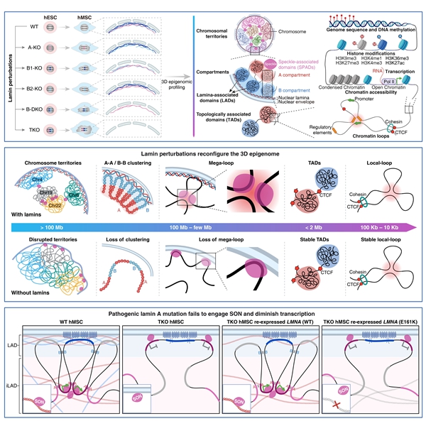 該研究在hESCs及其分化來源的hMSCs中構(gòu)建了lamins的單、雙、三敲除模型,系統(tǒng)揭示了lamins在基因組徑向定位與空間折疊中的核心作用,為理解生理性衰老及防治衰老相關(guān)疾病提供了新線索和潛在靶標(biāo)。同時,該研究揭示了核纖層病的潛在機(jī)制,將相關(guān)疾病的病理認(rèn)知推向了統(tǒng)一的“三維基因組紊亂”框架,為開發(fā)靶向lamin-SON軸的治療策略奠定了理論基礎(chǔ)。