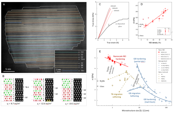 通過在鎳基過飽和固溶體合金中構(gòu)筑極高密度穩(wěn)定的“負(fù)能界面” (A、B),有效阻礙位錯(cuò)及界面運(yùn)動(dòng),完全抑制塑性變形,顯著提升楊氏模量(C、D),提升材料強(qiáng)度接近理論極限