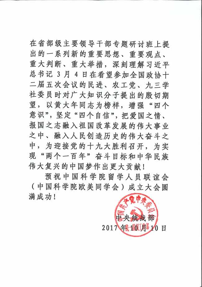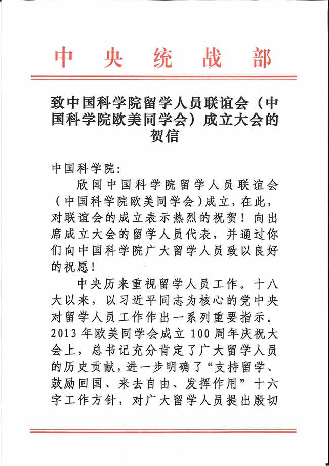 10月10日,中國科學(xué)院留學(xué)人員聯(lián)誼會(huì)(中國科學(xué)院歐美同學(xué)會(huì))在京成立,中央統(tǒng)戰(zhàn)部、歐美同學(xué)會(huì)專門發(fā)來賀信,全文如下: