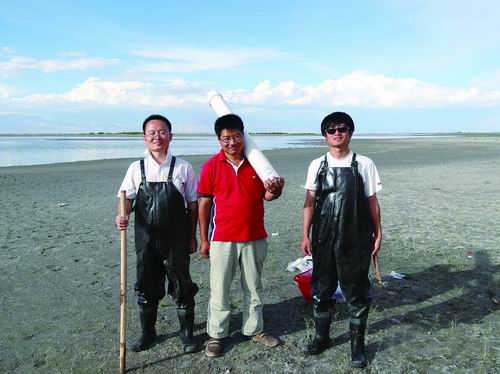 2013年7月,侯小琳(中)帶領(lǐng)團(tuán)隊(duì)在青海湖采集沉積物樣品。地球環(huán)境所供圖