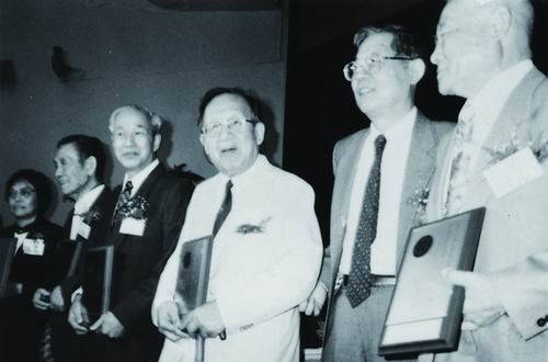 1995年,吳征鎰(右三)獲何梁何利基金科學(xué)與技術(shù)進(jìn)步獎(jiǎng)。