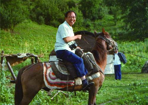 1982年,吳征鎰赴新疆考察,在伊犁新源縣野蘋(píng)果林下試馬。