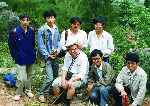 1988年,吳征鎰(前排左一)帶六名博士生在昆明西山考察。昆明植物所供圖