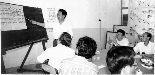 吳積善(站立者)和團隊在學(xué)術(shù)討論中。