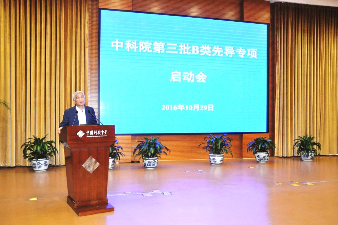 10月29日,中國科學(xué)院第三批戰(zhàn)略性先導(dǎo)科技專項(xiàng)(B類)啟動(dòng)會(huì)議在北京召開,中科院院長、黨組書記白春禮和副院長丁仲禮出席會(huì)議并講話,副秘書長汪克強(qiáng)出席會(huì)議。會(huì)議特別邀請(qǐng)詹文龍、趙忠賢、朱道本、許智宏、李曙光、李樹深等10位院士擔(dān)任咨詢專家對(duì)各專項(xiàng)進(jìn)行評(píng)議和指導(dǎo)。中科院前沿科學(xué)與教育局局長高鴻鈞主持會(huì)議。