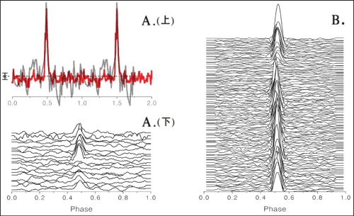 新發(fā)現(xiàn)脈沖星的歸一化平均脈沖輪廓和單脈沖。A(上)為FP1平均脈沖輪廓,F(xiàn)AST通過約52.4秒漂移掃描(紅色)產(chǎn)生信噪比為Parkes望遠(yuǎn)鏡L波段積分2100秒結(jié)果(灰色)信噪比的3倍,表現(xiàn)出FAST高靈敏度優(yōu)勢。A(下)為FP1單脈沖輪廓。B為FAST采用跟蹤觀測5分鐘,獲得的另一顆新脈沖星FP2的單脈沖輪廓。