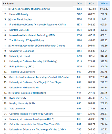 此次共有16家中國科研機(jī)構(gòu)和高校進(jìn)入全球總排名前100位,比上一年增加3家。除中科院外,還包括北京大學(xué)(12)、清華大學(xué)(13)、南京大學(xué)(19)、中國科學(xué)技術(shù)大學(xué)(24)、中國科學(xué)院大學(xué)(31)、浙江大學(xué)(42)、復(fù)旦大學(xué)(55)、上海交通大學(xué)(58)、南開大學(xué)(67)、廈門大學(xué)(70)、中科院化學(xué)研究所(73)、蘇州大學(xué)(75)、武漢大學(xué)(76)、中山大學(xué)(81)、蘭州大學(xué)(98)。在針對全球高校的排名中,中國科學(xué)技術(shù)大學(xué)位列第19位,中國科學(xué)院大學(xué)位列第26位。