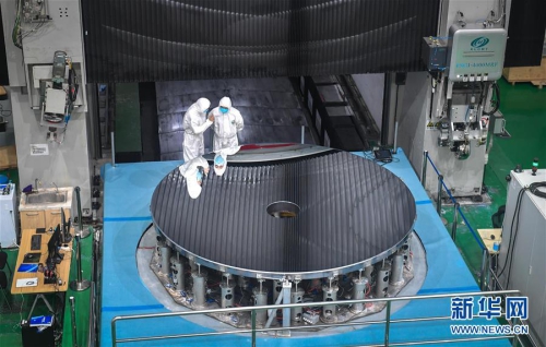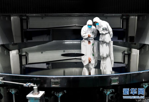 8月21日,科研人員在檢測塔檢查4米量級高精度碳化硅非球面反射鏡表面情況。新華社記者 許暢 攝