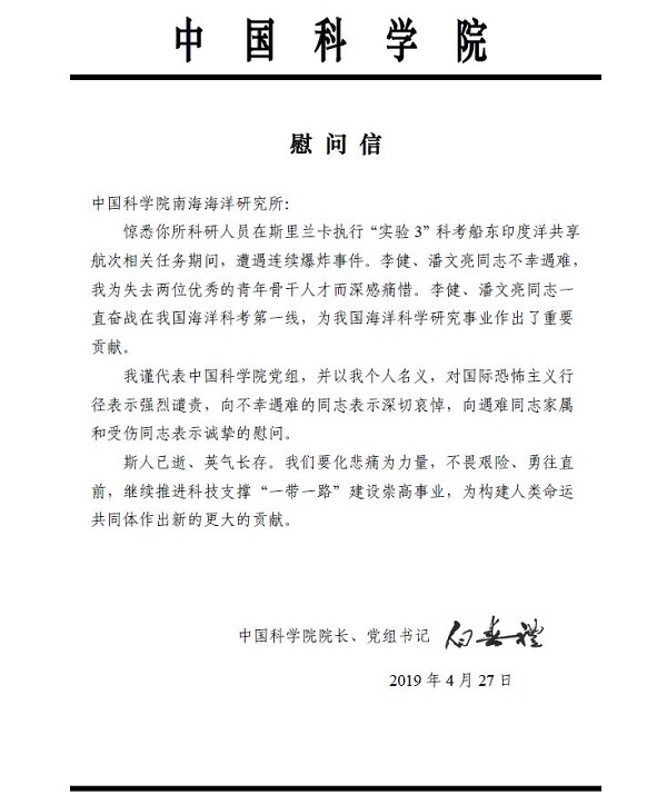 驚悉你所科研人員在斯里蘭卡執(zhí)行“實(shí)驗(yàn)3”科考船東印度洋共享航次相關(guān)任務(wù)期間,遭遇連續(xù)爆炸事件。李健、潘文亮同志不幸遇難,我為失去兩位優(yōu)秀的青年骨干人才而深感痛惜。李健、潘文亮同志一直奮戰(zhàn)在我國海洋科考第一線,為我國海洋科學(xué)研究事業(yè)作出了重要貢獻(xiàn)。