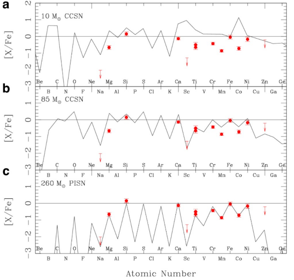 理論研究表明第一代恒星的質(zhì)量可以達(dá)到太陽質(zhì)量的數(shù)百倍,但人們一直未能從觀測(cè)上發(fā)現(xiàn)相關(guān)證據(jù)。通常發(fā)現(xiàn)的極貧金屬星保留了核坍縮超新星(CCSN)的核合成產(chǎn)物,但這些超新星的前身星普遍小于100倍太陽質(zhì)量。對(duì)于質(zhì)量介于140至260倍太陽質(zhì)量的第一代恒星而言,其核心處產(chǎn)生的正負(fù)電子對(duì)會(huì)減弱恒星內(nèi)部輻射壓力,并導(dǎo)致恒星坍縮形成一種特殊的超新星,即PISN。與CCSN相比,PISN產(chǎn)物具有極為特殊的化學(xué)組成,在其演化后形成的氣體云中誕生的第二代恒星會(huì)展現(xiàn)出極其罕見的化學(xué)豐度模式。