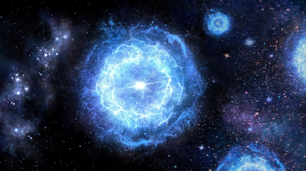 第一代超大質(zhì)量恒星演化成為對(duì)不穩(wěn)定超新星的藝術(shù)展示圖。對(duì)不穩(wěn)定超新星將富含多種元素的物質(zhì)拋射到星際介質(zhì)中,并以此形成下一代恒星。
