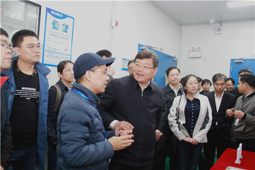 在新材料初創(chuàng)產(chǎn)業(yè)園,胡祖才一行走訪了浙江鋒鋰新能源科技有限公司,參觀了生產(chǎn)線,聽取了關(guān)于固態(tài)鋰離子電解質(zhì)材料和固態(tài)鋰離子動力電池的產(chǎn)業(yè)化發(fā)展情況,就項目技術(shù)優(yōu)勢、產(chǎn)品應(yīng)用領(lǐng)域等進行了交流。