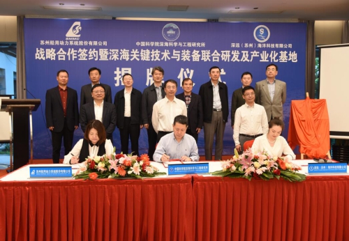 4月23日,中國科學院深??茖W與工程研究所、蘇州船用動力系統(tǒng)股份有限公司、深遠(蘇州)海洋科技有限公司合作簽約儀式在蘇州舉行。
