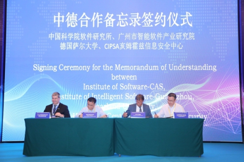 開幕式上,軟件所、廣州市智能軟件產(chǎn)業(yè)研究院、德國薩爾大學(xué)、德國CIPSA亥姆霍茲信息安全中心、德國馬普信息研究所、德國馬普軟件系統(tǒng)研究所簽署了合作備忘錄,并簽約共建中歐可靠智能軟件聯(lián)合實(shí)驗(yàn)室。雙方將在計(jì)算機(jī)科學(xué)學(xué)術(shù)研究、高等教育、出版物資源共享等領(lǐng)域開展合作,成立聯(lián)合實(shí)驗(yàn)室將助力推進(jìn)智能軟件領(lǐng)域的基礎(chǔ)研究工作。