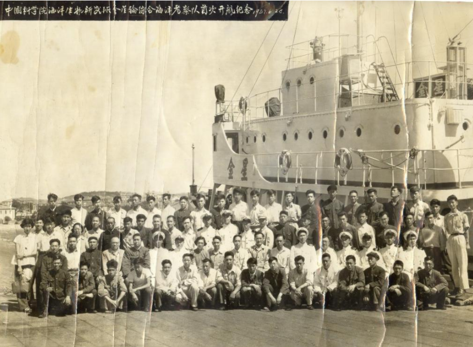 1957年6月,經(jīng)改造的“金星”號(hào)出廠,作為新中國(guó)首艘遠(yuǎn)洋科學(xué)考察船正式進(jìn)入海洋所海洋調(diào)查船序列?!敖鹦恰碧?hào)首航海洋科學(xué)考察船隊(duì)員合影。