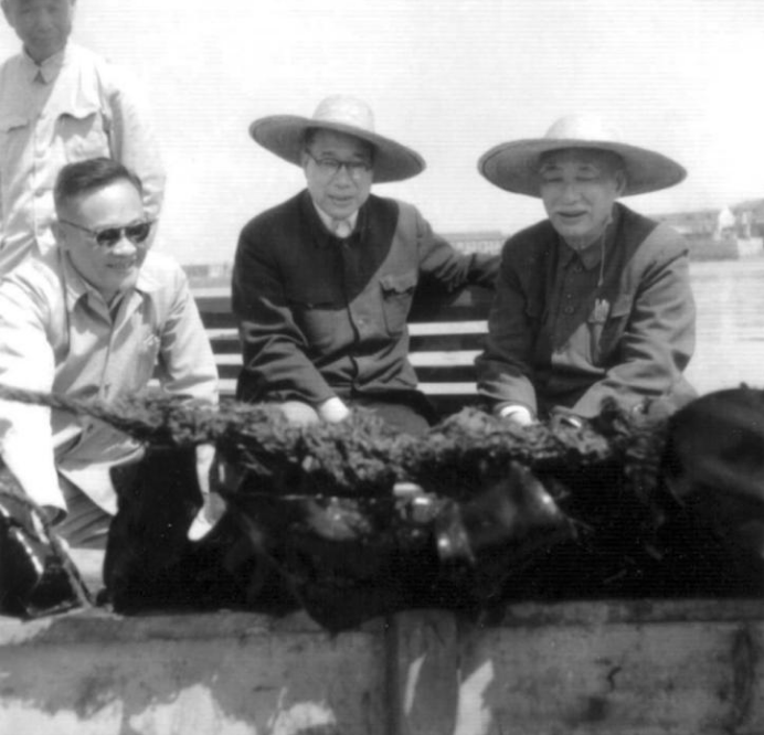 1965年6月,國(guó)家教育部副部長(zhǎng)葉圣陶(右一)在海洋所副所長(zhǎng)曾呈奎(左一)、山東海洋學(xué)院生物系主任方宗熙(左二)、海洋所副所長(zhǎng)郭志堅(jiān)(站)陪同下,在青島觀察海帶生長(zhǎng)情況。海洋所供圖