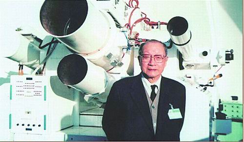 1994年,王大珩在大型電影經(jīng)緯儀前留影。長春分院供圖