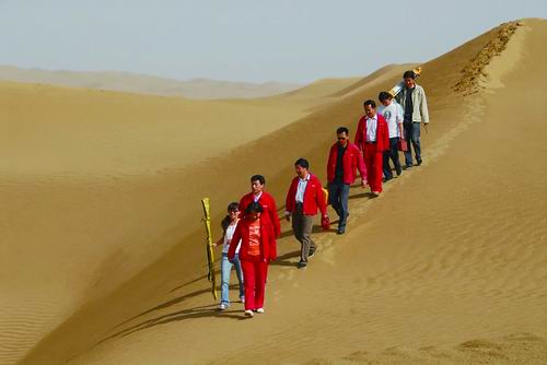 2006年,“彭加木突擊隊(duì)”開展塔里木沙漠公路風(fēng)沙防治工程野外勘測(cè)工作。新疆分院供圖