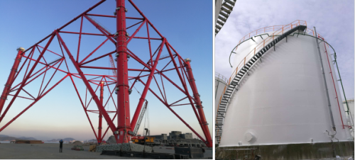 左:世界最高輸電塔涂裝工程;右:大型原油儲(chǔ)罐整體防腐涂裝
