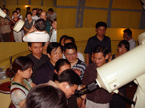 聽科學家講授天文知識 多年來,紫金山天文臺一直視天文普及為己任,曾自籌資金100萬元,創(chuàng)建中國第一座天文歷史博物館,并在該園區(qū)內(nèi)開辟科普專區(qū),建成了一套完善、一流的科普基地。該臺全年向社會開放,接待參觀人數(shù)已達240多萬人,近四年已超過120萬人次,取得了明顯的社會效益和經(jīng)濟效益。1998年,該臺創(chuàng)建了中國天文臺領域內(nèi)的首家科普網(wǎng)站。曾在網(wǎng)上直播獅子座流星雨,由專家現(xiàn)場講解并指導,創(chuàng)科普網(wǎng)站24小時點擊率最高記錄5萬余次。他們還年年有投入,年年添新品:1999年,該臺開放太陽色球望遠鏡,讓公眾直觀太陽活動;2000年舉辦了“世界天文郵品展”,讓公眾在方寸之間領略宇宙之奧秘,得到了中宣部領導的贊賞; 2001年,開放三十年代遠東最大的、最具歷史意義的天文望遠鏡,用于科普教育,滿足了公眾的求知欲;同年成功舉辦了“吳同椿星云美術作品展”;2002年,該臺投資近20萬元,配置了具有先進終端的望遠鏡,供愛好天文的公眾觀星,提高了科普工作的層次;同年制作了具有收藏價值的旅游紀念品《紫金山天文臺專題郵冊》;2003年,該臺完成中國科協(xié)科普資助項目“星云作品”展板;2004年投資20萬元,完成中國科協(xié)科普資助項目“光纖動態(tài)模擬星圖”的研制,并制造了“天文展示系統(tǒng)及宇宙體重磅” 科普設備;同年出版了與“科學”教材配套的精編科普讀物《親近宇宙》書籍;與江蘇教育電視臺聯(lián)合制作大型科普系列片“趣味無窮的天文現(xiàn)象”,目前已完成四集。